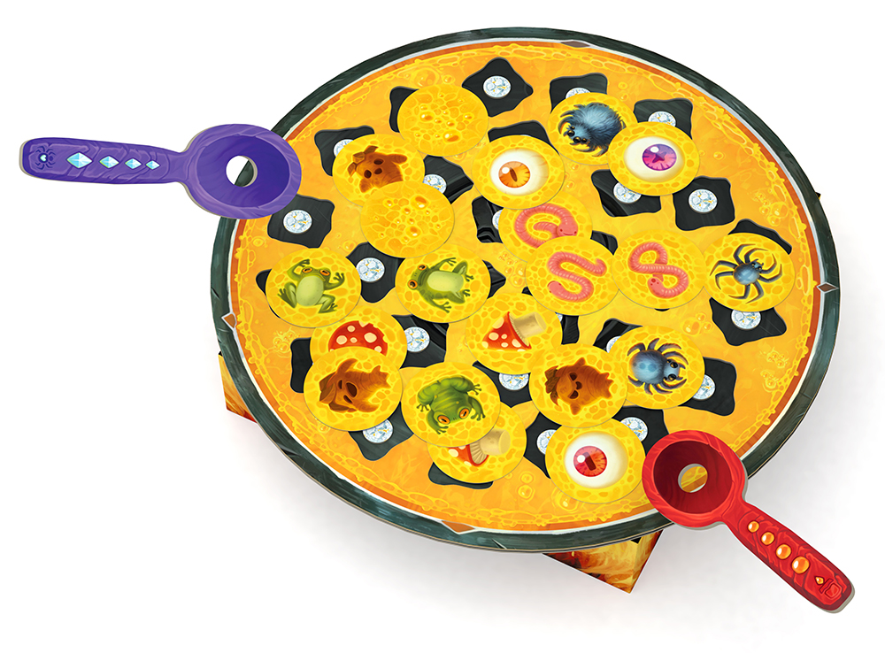 В ходе игры вы будете по очереди объединяться в пары для поединков и соревноваться в том, кто достанет из котла больше подходящей еды. По команде шарьте ложками в котле и вытаскивайте притянутые к волшебной ложке карточки еды. За одну игру каждый игрок может принять участие в таком поединке до 6 раз.