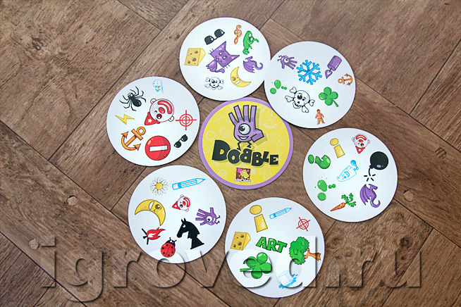 Доббль – быстрая весёлая игра на внимательность и реакцию. На каждой карточке по 8 изображений, и только одно из них совпадает с изображением на любой другой карточке. Несмотря на детское оформление, серия мини-игр с карточками «Доббля» прекрасно развлечёт и взрослую компанию.
