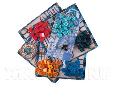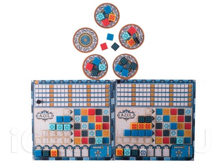 Компоненты настольной игры Азул (Azul)По высочайшему приказу. Завезённое в Европу традиционное мавританское искусство азулежу (изначально белая и голубая керамическая плитка) сейчас является неотъемлемой частью португальской культуры и визитной карточкой португальского архитектурного стиля. Некогда король Португалии Мануэль I, восхищённый красотой азулежу, повелел облицевать такой плиткой стены собственной резиденции в Эворе. Благодаря настольной игре Азул вы тоже можете поучаствовать в украшении королевского дворца. Состязание начинается!