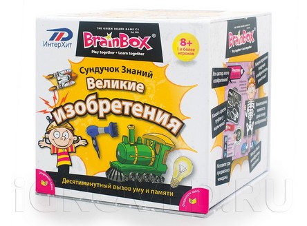 Компоненты настольной игры Сундучок Знаний: Великие изобретения Семейная настольная игра Сундучок знаний: Великие изобретения – это увлекательная викторина, в которую можно играть одному и с друзьями. Вы сможете открыть для себя множество интересных изобретений человечества и узнать любопытные подробности о них.