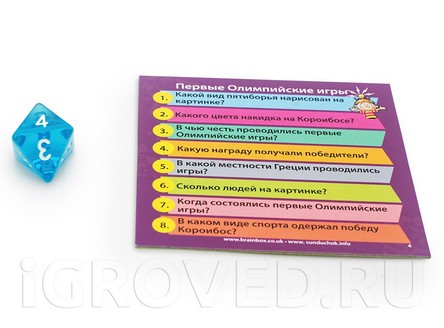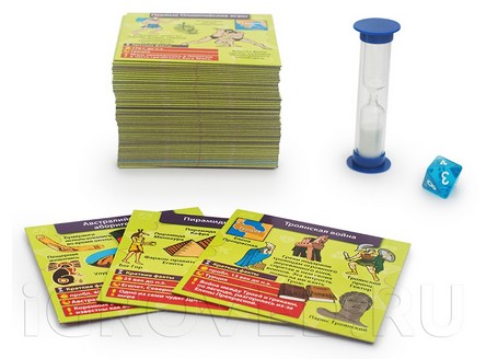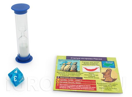 Что можно узнать за 10 секунд? Очень много. Берём карточку, на которой изображена известная личность или описано какое-то событие. Пристально смотрим на неё 10 секунд, пока идут песочные часы, затем переворачиваем. Один из игроков бросает кубик и отвечает на вопрос под тем номером, который выпал на кубике. Правильно – берёт карточку себе, как победное очко.