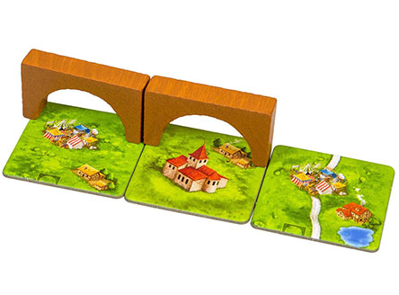 Дополнение «Мосты, замки и базары». Торгуйте на базарах, соединяйте дороги мостами и превращайте маленькие города в живописные замки, получая дополнительные очки за будущие постройки. Состав дополнения: 12 квадратов местности, 12 жетонов замков, 12 фишек мостов.