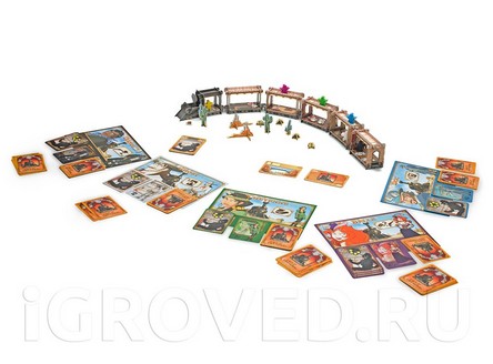 Компоненты настольной игры Кольт Экспресс (Colt Express)Большое ограбление поезда. Шестёрка лихих бандитов из настольной игры Кольт экспресс (Colt Express) устроила налёт на поезд с богатенькими пассажирами. Но вот беда – грабители действуют порознь, не имеют чёткого плана действий, а в поезде едет сам шериф…