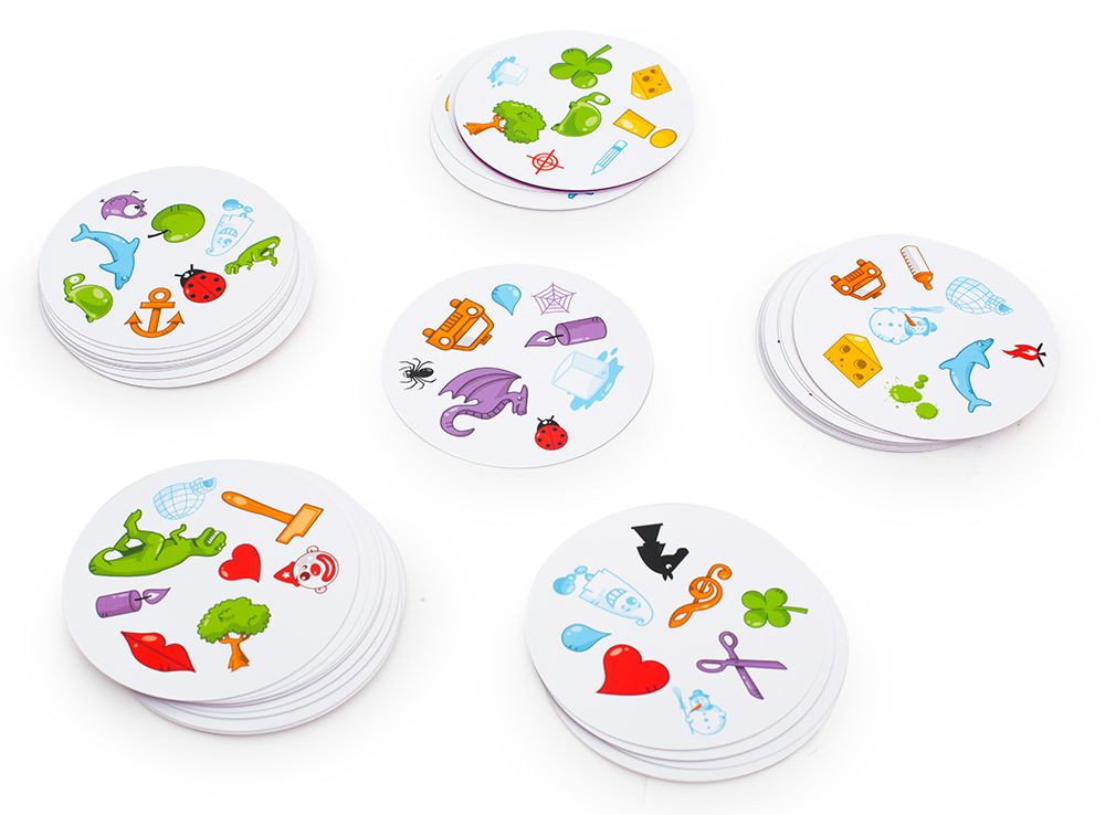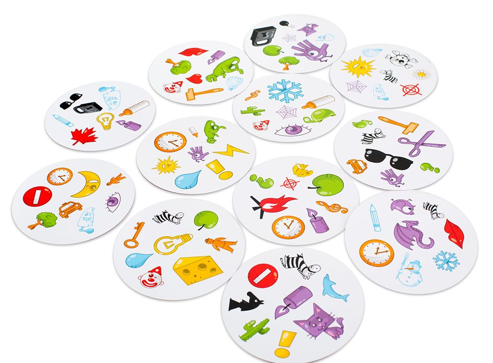 Компактная круглая коробочка содержит круглые карточки с множеством картинок: это могут быть животные, растения, символы, надписи, смайлики... Каждая карточка уникальна, но на каждой паре карточек имеется одна (и только одна) общая для этих карточек картинка. Именно на поиске этого совпадения и построена настольная игра Доббль (Dobble или Spot It!).
