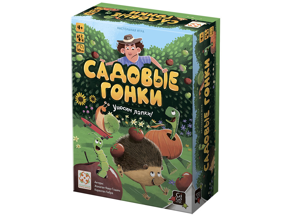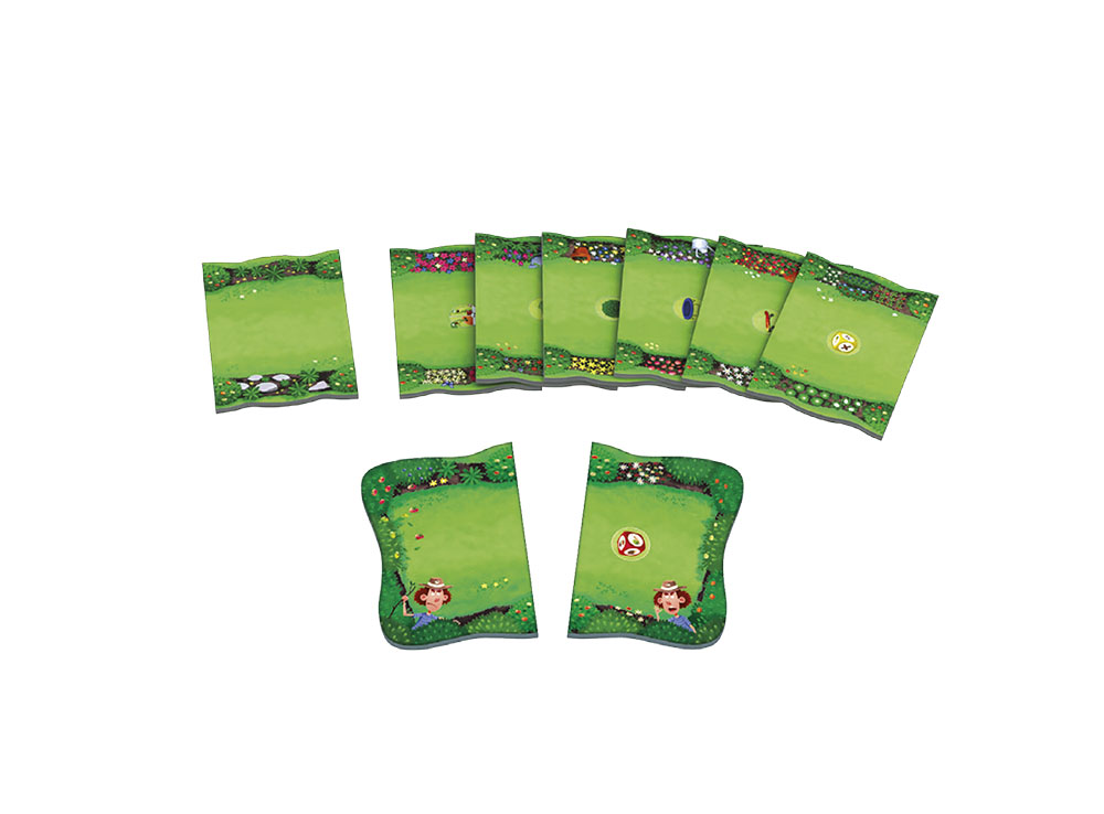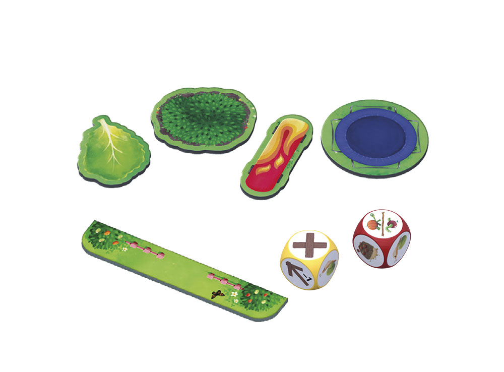 В состав настольной игры Садовые гонки входят: 4 фишки животных, 4 карты животных, двухсторонний стартовый тайл, 7 двухсторонних тайлов сада,тайл калитки, 4 жетона предметов, 2 кубика, .