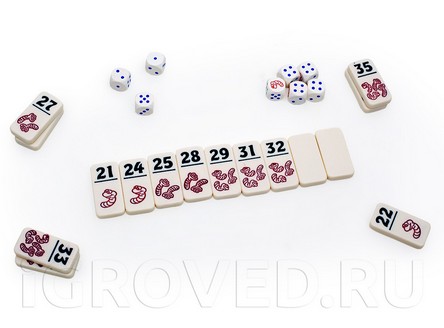 Подготовка к настольной игре Хекмек. Прежде чем начать играть, выложите на стол ряд костяшек-домино с цифрами от 21 до 36. На каждой косточке помимо цифр изображены червячки (от одного до четырех). Освободите немного места перед каждым игроком (сюда будет складываться стопка из костяшек). Далее участники определяют, кто будет ходить первым. Игра началась.