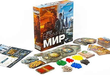 В состав настольной игры «Этот безумный мир входят»: 5 частей игрового поля; 5 двусторонних карт Империй; 150 карт Развития; 170 кубиков Ресурсов (Материалы 35 , Энергия 30, Знания 30, Деньги 30, Открытия 30, Кристаллиум 15 ); 80 жетонов Лидеров (40 Генералов и 40 Финансистов ); жетон счётчика раундов; блокнот для подсчёта победных очков; буклет с правилами.