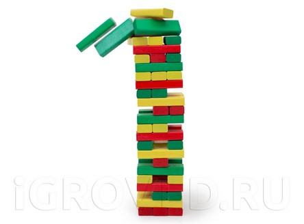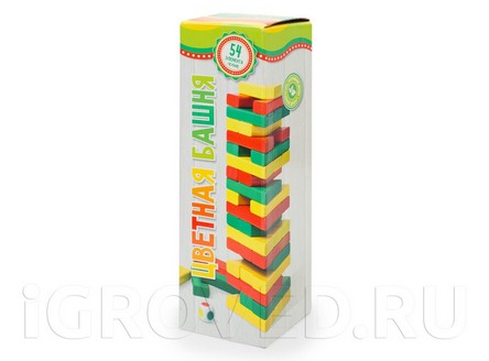 Состав настольной игры Башня (с цветными брусками и кубиком, берёза): 54 бруска и один кубик, правила.В настольной игре Башня (или Дженга) вам предстоит выстраивать башню из деревянных брусков, вынимая бруски с нижних «этажей» и докладывая их наверх. Всё начинается с 16-ти уровневой башни, но за время игры башня может подрасти раза в два ;) Всё зависит от вашей аккуратности. Но рано или поздно, башня станет слишком неустойчивой и один из игроков, стараясь достать «не тот» брусок из середины башни, с грохотом обрушит всё сооружение! Этот неосторожный игрок проиграл, зато остальные выиграли – можно начать строительство башни заново :)