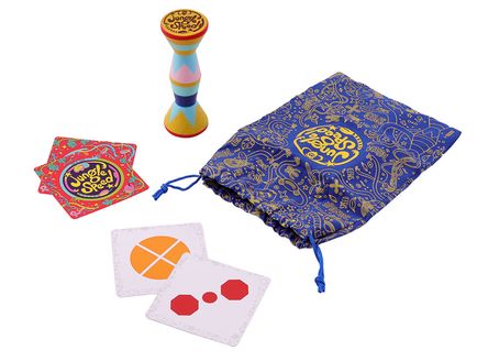 В состав настольной игры Дикие Джунгли (Jungle Speed) входят: 1 деревянный тотем, 70 карточек, тканевый мешочек, правила игры.