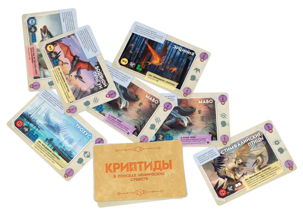 В состав настольной игры «Криптиды. В поисках мифических существ» входят: 16 карточек криптидов I уровня, 15 карточек криптидов II уровня, 12 карточек криптидов III уровня, 13 карточек контрактов, 4 планшета игроков, 1 игровое поле, 10 жетонов бонусных слухов, 32 жетона доказательств, 1 заповедник, 51 тайл местности, 43 тайла криптидов, 3 забора заповедника, 4 фишки криптозоологов, 8 жетонов ставок, 20 монет номиналом 1/ 10 монет номиналом 3, 4 фишки помощников, 32 фишки криптидов, 8 маркеров действий, 20 жетонов опыта, 40 маркеров навыков, 5 кубиков помощника, 2 кубика отслеживания, 1 мешочек доказательств, 4 памятки, 1 блокнот для подсчёта очков, правила игры.