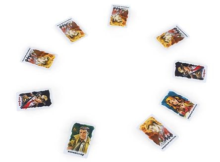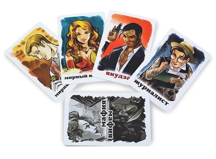 Список персонажей: 8 карточки Мафии (4 карточки Мафии, 1 карточка Дона Мафии, 3 карточки Якудза), специальная карточка Адвокат (играет за Мафию), 11 карточек Мирных жителей (6 юношей и 5 девушек), 7 специальных карточек Мирных жителей (Комиссар, Медсестра, Шериф, Красотка, Лунатик, Журналист, Капитан), 1 карточка независимого персонажа Маньяк, 4 дополнительных персонажа, которые вы можете использовать для своих вариантов игры (Танцовщица, Боец, Одноглазый, Толстяк).
