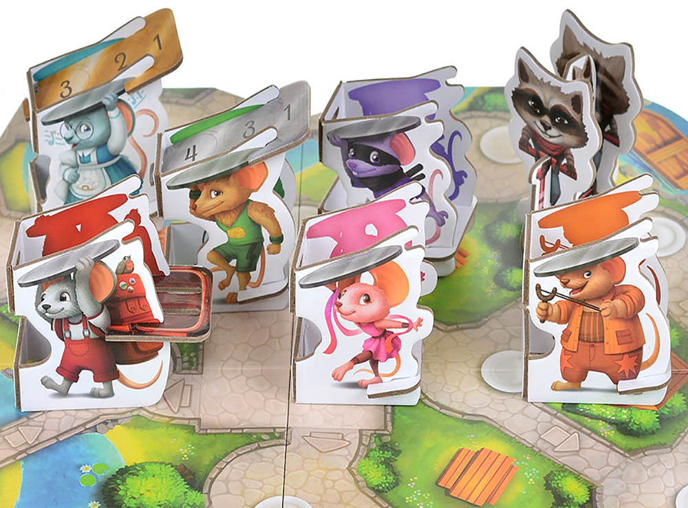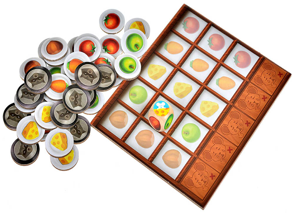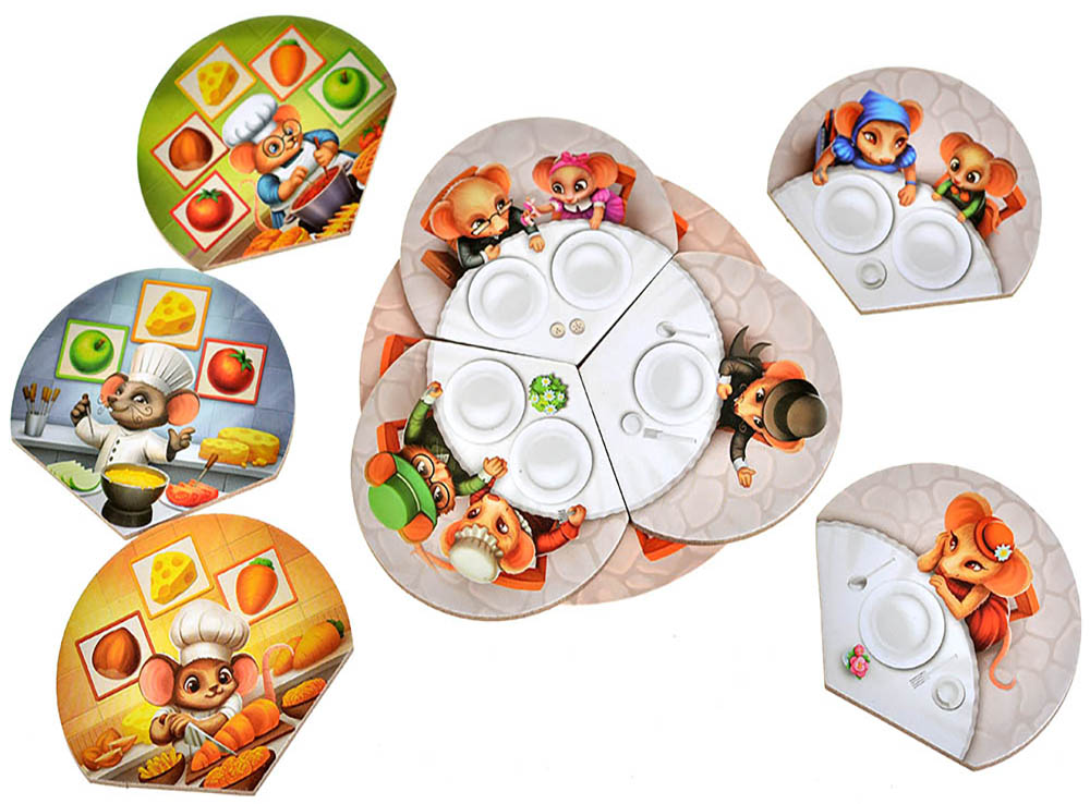 В состав настольной игры «Мышиное новоселье» входит: кубик еды, 8 нор, пиццерия, обеденный стол, кладовка енота, 30 двухсторонних жетонов общей еды,10 жетонов еды енота, фигурка енота, 6 фигурок мышей, 2 двухсторонних подноса для еды, игровое поле, правила игры.