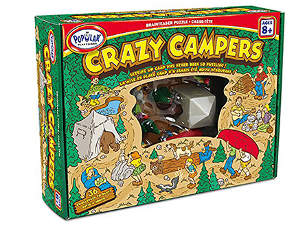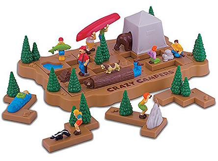 Настольная игра-головоломка Crazy Campers включает: 11 деталей с фигурками персонажей на основании различной геометрической формы, чтобы собирать головоломки на игровой доске, и книжку с заданиями, советами и решениями.