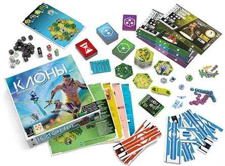 В состав настольной игры «Клоны: Перезагрузка» входят: 256 жетонов; 121 карта; 29 участков; 25 кубиков; 4 планшета персонажей; 4 фигурки персонажей; 4 сборных трека славы; 4 двусторонних руководства игрока; 1 атлас; правила игры.