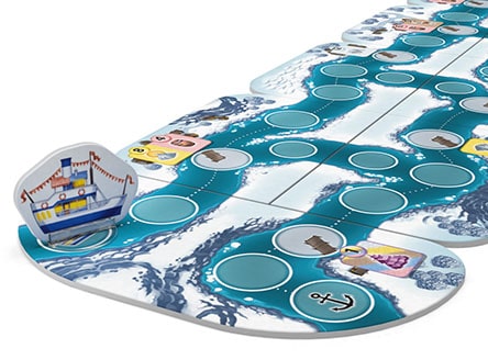 Модульное игровое полеОдеваемся теплее и отправляемся в путь! В игре используется модульное поле, состоящее из двенадцати тайлов реки и показывающее маршрут круизного лайнера. Он начинает свой путь с запада, двигаясь по белой пунктирной линии на восток, где затем поворачивает и идёт обратно на запад. Игра заканчивается, когда корабль пришвартуется на ячейке с символом якоря. Каждый раунд состоит из трёх фаз: