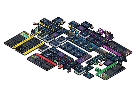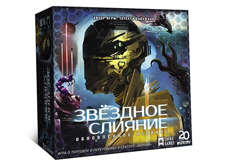 В состав настольной игры «Звёздное слияние» входит: 30 жетонов 1 ПО; 20 жетонов 2 ПО; 10 жетонов 5 ПО; 30 жетонов 10 ПО; 9 жетонов «×5»; 54 жетона 1 корабля; 22 жетона 3 кораблей; 11 жетонов признания фодеронов; 6 жетонов семян («×2») кейлионов; 7 жетонов посыльных дзетов; 8 жетонов вымогательства дзетов; 45 маленьких зелёных кубиков (пища); 45 маленьких белых кубиков (культура); 45 маленьких коричневых кубиков; (промышленность); 35 больших чёрных кубиков (информация); 35 больших синих кубиков; (биотехнологии); 35 больших жёлтых кубиков (энергия); 12 больших серых кубиков (джокеры Единства); 16 маленьких серых кубиков (джокеры Единства); 24 восьмиугольные фишки (сверхтехнологии); 9 ширм игроков; 41 карта технологий/научных групп; 40 карт колоний; 9 карт пожертвований; 12 карт слияния; 9 начальных карт видов; 26 карт кейлионов; 32 карты эниетов; 38 карт фодеронов; 33 карты имдрильцев; 25 карт кьясов; 41 карта китов; 29 карт Единства; 27 карт йенгиайцев; 27 карт дзетов; правила игры. Размер игровых карточек: 63.5 на 88 мм - 380 карт.