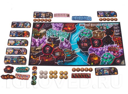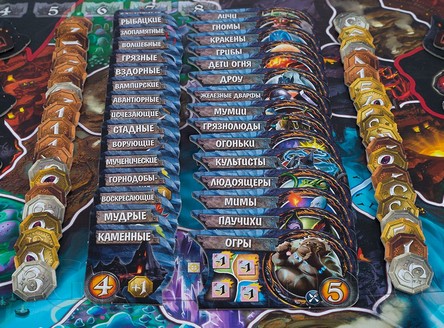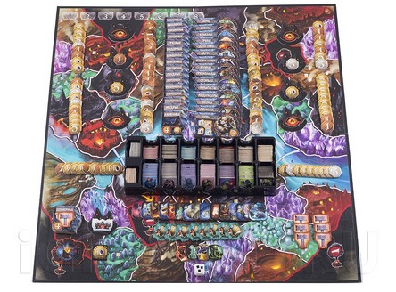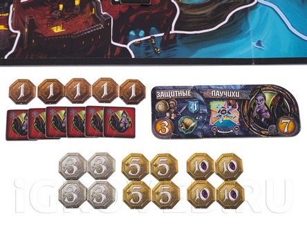 Качество компонентов настольной игры Подземный Мир - на высоте! Разные варианты поля, множество жетонов, Знамёна Рас и Знаки Способностей, которые соединяются в единую комбинацию, и всё это из плотного картона. А кроме того, производители до деталей продумали распределение компонентов в коробке - мало того, что у каждой детали есть своя собственная ниша в коробке, ещё и сделан специальный съёмный лоток-органайзер, который вынимается из коробки и используется во время игры. Нет необходимости искать нужный жетон в куче компонентов - они все лежат в этом лотке, каждый на своем месте.