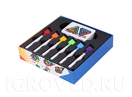 Перепутанные колпачки. С каждым заданием настольная игра Скоростные цвета усложняется, поскольку при подготовке к новому раунду два маркера меняются колпачками. Таким образом, выбирая маркер, игрок никогда не может быть уверен, тот ли цвет ему достанется. Играя с малышами (от 4-5 лет), можно отменять этот принцип, а для более взрослой и опытной компании существуют дополнительные, более строгие правила. Так как уровень сложности можно менять в зависимости от возраста игроков, настольная игра Скоростные цвета полюбится и взрослым, и детям, и смешанным компаниям – ведь раскрашивать наперегонки так весело!