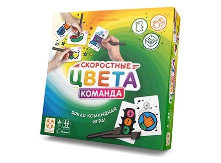Двусторонние карточки с изображениями«Скоростные цвета. Команда» - идеальная игра для семей с детьми и компаний друзей. Новые правила включают динамические задания и командную работу, так что скучать никому не придётся. Игра является отличным расширением для оригинальной «Скоростные цвета», но в неё можно играть отдельно, так как обе игры совершенно самостоятельные. Если вы планируете играть большой компанией, то рекомендуется иметь две или более копий игры.
