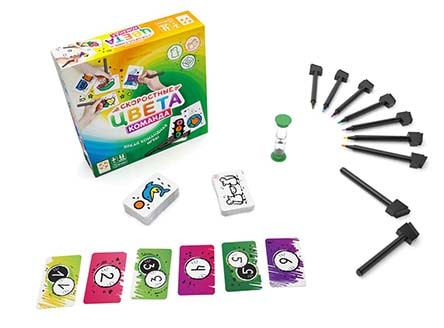 Состав настольной игры «Скоростные цвета. Команда»: 55 двусторонних карт с картинками; 6 стартовых карт; 7 специальных маркеров со стирающими колпачками; 3 особых маркера; 1 песочные часы на 5 минут; правила игры.