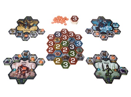 В состав настольной игры Стальная арена. Бои роботов по пятницам входят: 4 жетона роботов, 4 планшета роботов, 16 тайлов 1-го поколения, 30 тайлов 2-го поколения, 30 тайлов 3-го поколения, 40 жетонов перегрева, правила игры.