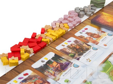 Свиньи и кирпичи. В комплект настольной игры Туманная дорога (Via Nebula) входят: 1 игровое поле, 4 планшета гильдии, 42 карты, 24 стройплощадки 4 цветов, 60 тайлов луга, 20 жетонов разработки, 5 специальных жетонов разработки, 20 строений, 12 мастеров (по 3 для каждого игрока), 90 ресурсов (древесина, еда, камень, глина, пшеница). Правила настольной игры Туманная дорога (Via Nebula) на русском языке Игровед прикладывает к каждому экземпляру игры.