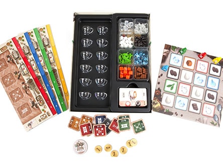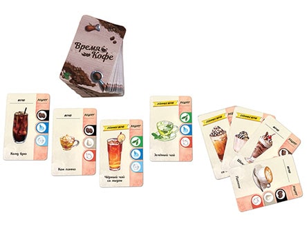 В состав настольной игры Время кофе входит: фишки ингредиентов – 102 шт., планшеты игроков – 4 шт., карточки заказов – 80 шт., фишки чашек – 12 шт., поле ингредиентов, жетоны – 32 шт., фишки – 6 шт., правила игры .